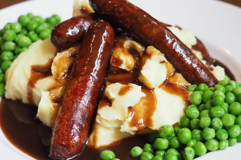 - Pork sausages in gravy